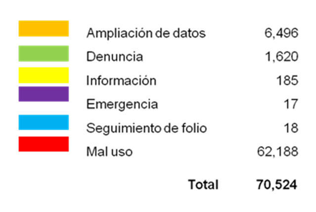 La SSPE informó además que el sistema de Denuncia Anónima obtuvo el año pasado un total de 70 mil 524 reportes, de los cuales 62 mil 188 fueron de mal uso y broma, lo que representa un 88.18 por ciento del total; 6 mil 496 de ampliación de datos; 185 para pedir información; 17 llamados de emergencia; 18 de seguimiento de folio; y sólo 1 mil 620 fueron llamados de denuncia reales que corresponden a un 2.30 por ciento del total de este sistema.