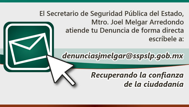 Como parte de la proximidad social que tiene la SSPE con la población se pone a disposición de los potosinos el correo electrónico denunciasjmelgar@sspslp.gob.mx mismo que será atendido personalmente por el Secretario de Seguridad Pública en el Estado, Mtro. Joel Melgar Arredondo.