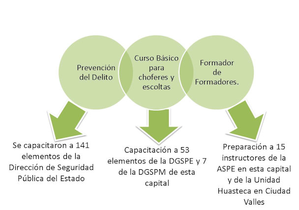 •En este periodo se capacitaron a 614 elementos en las sedes de San Luis Potosí y Ciudad Valles de la Academia de Seguridad Pública del Estado, en contenidos de: