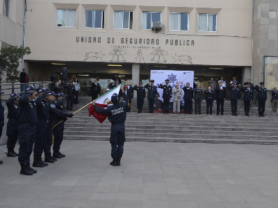 Después, en la explanada del edificio de seguridad pública se rindieron los honores a la bandera correspondientes y se hizo entrega de ofrendas florales al muro de los policías caídos en cumplimiento de su deber, en donde los funcionarios montaron una guardia de honor.