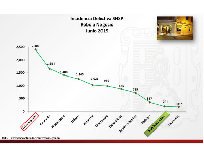 El robo a comercio bajó un 49% este 2015, pues el año pasado se tienen registrados 410 contra 201 que se han presentado este año. Guanajuato tiene 2 mil 406 robos, Querétaro 989, Aguascalientes 715, Tamaulipas 875, Jalisco 1 mil 275.