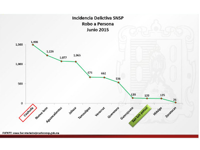Los robos a transeúntes también van a la baja, ya que el año anterior se presentaron 304 y este 129, lo que representa un decremento en ese delito de un 42 por ciento. Otras entidades circunvecinas como Querétaro registran 536, Nuevo León 1 mil 226, Coahuila 1 mil 498.