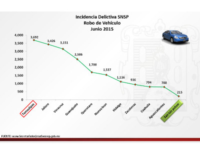 El robo de vehículo disminuyó en San Luis Potosí un 45%, pues de 477 hurtos que se tenía el periodo pasado de 2014, ahora sólo se han registrado 215. Estados como Tamaulipas tienen 3 mil 692 unidades robadas, Jalisco 3 mil 426, Guanajuato 2 mil 506, Querétaro 1 mil 700, Zacatecas 936 y Aguascalientes 788.