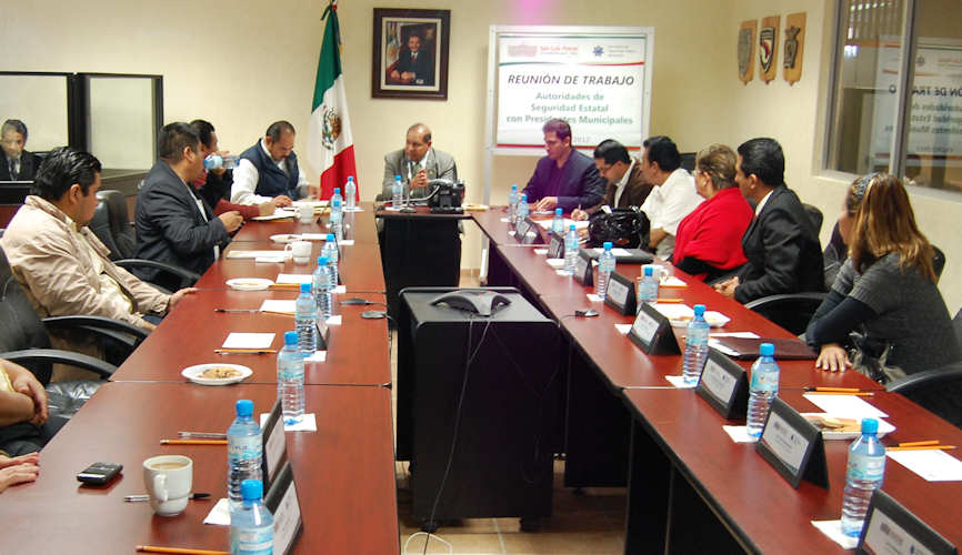 En las instalaciones de la SSPE se reunieron los alcaldes de las cuatro zonas del estado con el Secretario de Seguridad Pública, Heliodoro Guerrero Guerrero en donde convinieron que es fundamental que los elementos de seguridad municipal sean examinados para que se tenga la certeza de que no están consumiendo alguna substancia prohibida o droga cuando llevan a cabo sus funciones.