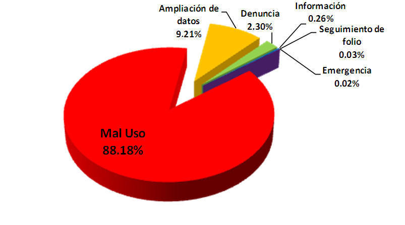 La SSPE informó además que el sistema de Denuncia Anónima obtuvo el año pasado un total de 70 mil 524 reportes, de los cuales 62 mil 188 fueron de mal uso y broma, lo que representa un 88.18 por ciento del total; 6 mil 496 de ampliación de datos; 185 para pedir información; 17 llamados de emergencia; 18 de seguimiento de folio; y sólo 1 mil 620 fueron llamados de denuncia reales que corresponden a un 2.30 por ciento del total de este sistema.