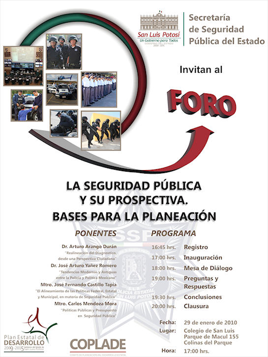Con la presencia de especialistas reconocidos a nivel nacional en la materia, la Secretaría de Seguridad Pública del Estado llevará a cabo su Foro de Expertos con el tema “La Seguridad Pública y su prospectiva. Bases para la planeación”, como parte del proceso para la conformación del Plan Estatal de Desarrollo 2009-2015.