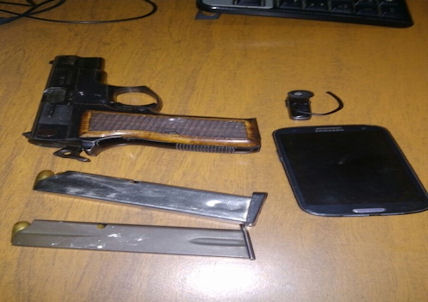 Al momento de su aseguramiento, al presunto se le encontró fajada en la cintura del lado izquierdo un arma de fuego, tipo escuadra, calibre 9 mm y 02 cargadores abastecidos, con 12 y 08 cartuchos, respectivamente, y un celular marca Samsung color negro.