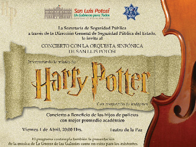 Dicho concierto estará a cargo de la Orquesta Sinfónica de San Luis Potosí, dirigida por el maestro José Miramontes Zapata, quienes interpretarán la música de las películas de Harry Potter.