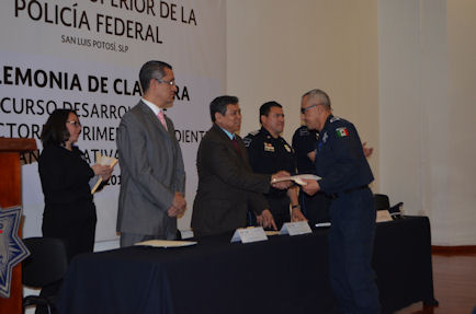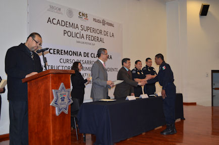 En la ceremonia realizada en la Academia de la Policía Federal, el Secretario de Seguridad Pública del Estado, General Arturo Gutiérrez García, acompañado de Roberto Salinas Díaz, Director de la Academia Superior de la Policía Federal; del Comisario Jaime Ernesto Pineda Arteaga, Coordinador Estatal de la Policía Federal y de Aldo Torres Villa, Secretario Ejecutivo del Consejo Estatal de Seguridad Pública, llevó a cabo la clausura del taller y la entrega de Constancias que avala como instructores a los policías.