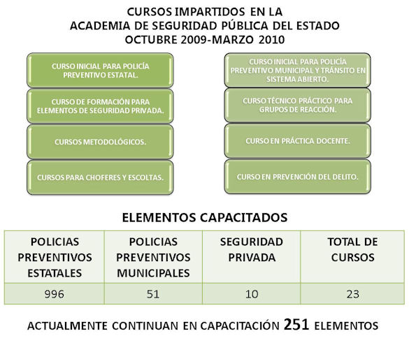 • El primero de marzo del 2010, egresaron de la Academia de Seguridad Pública del Estado 69 nuevos elementos, a los cuales se les otorgó una plaza y todos los beneficios laborales a los que tienen derecho. Se invirtió un millón 778 mil 589 pesos.